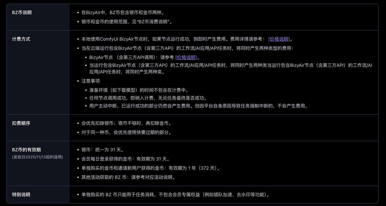 - BizyAir节点 (含第三方API调用):请参考 [价格说明]。