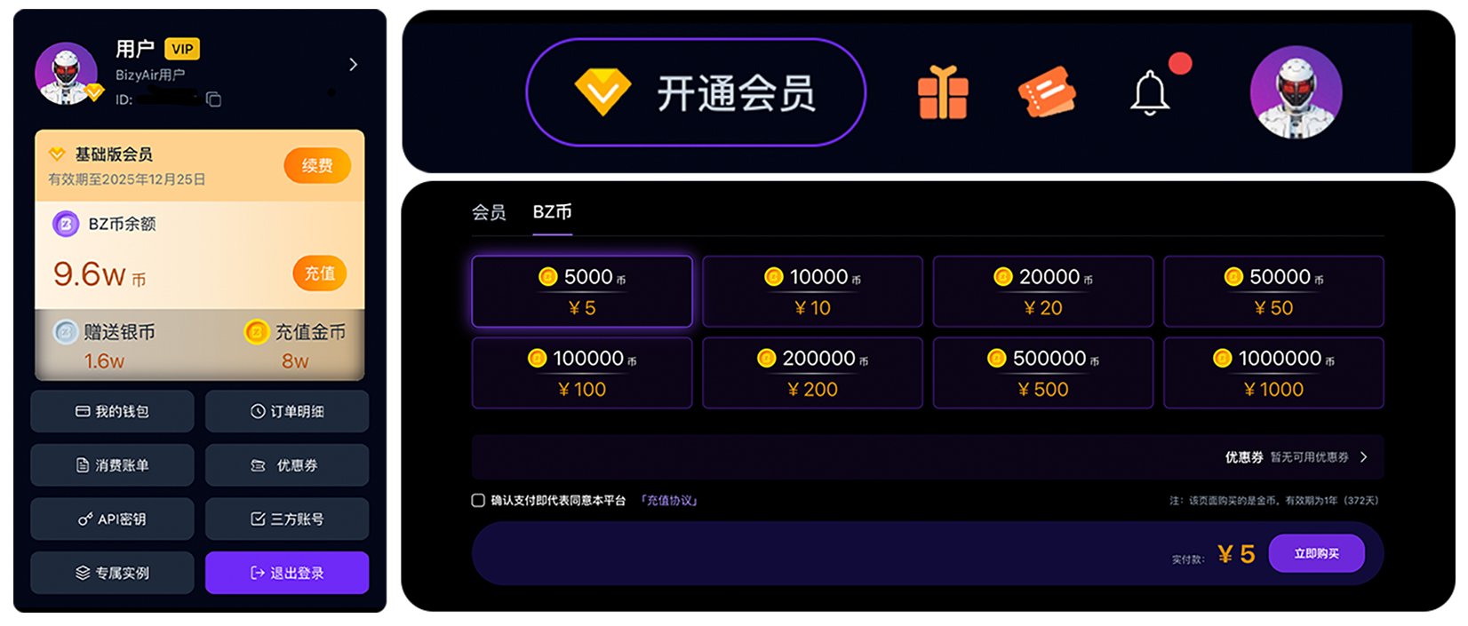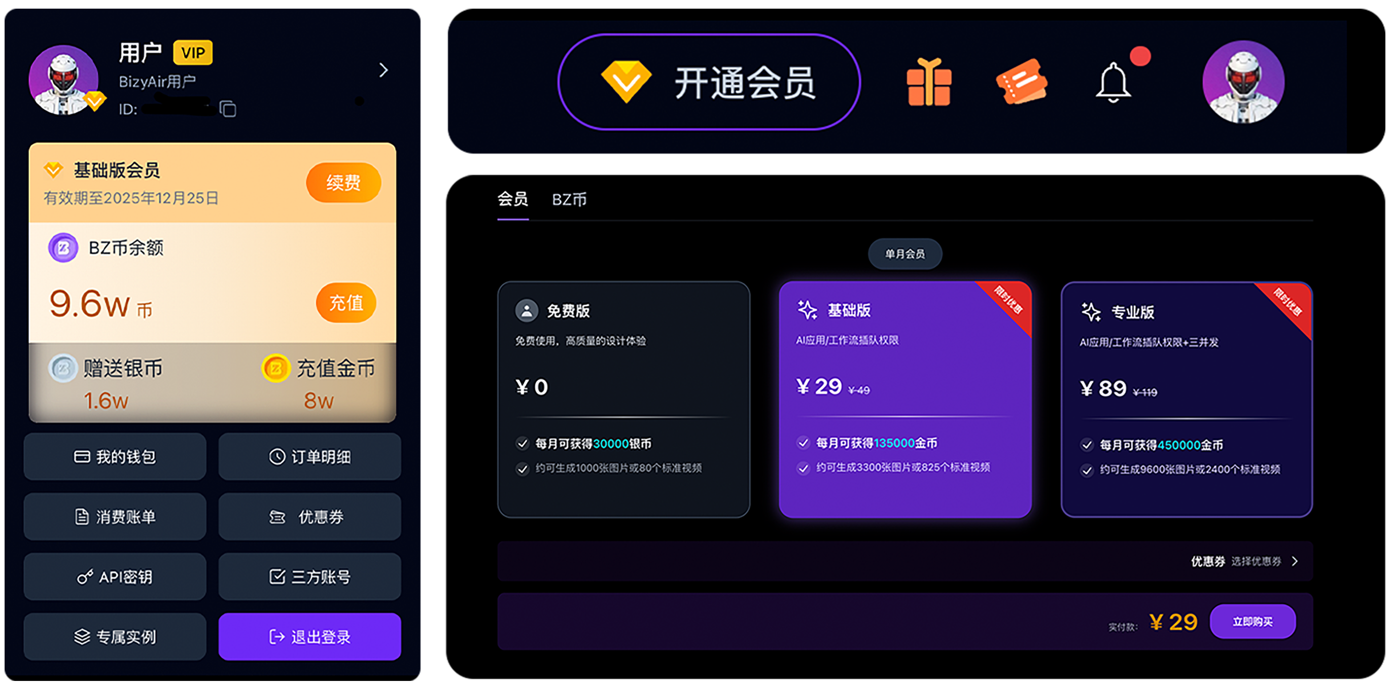 免费版会员可运行 BizyAir 中绝大多数的工作流和AI应用(非金币消耗类),适合想要了解 BizyAir 的新用户,且新用户注册还会一次性赠送1000金币与4000银币。